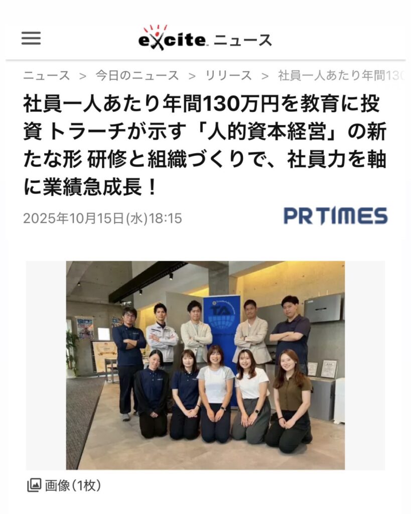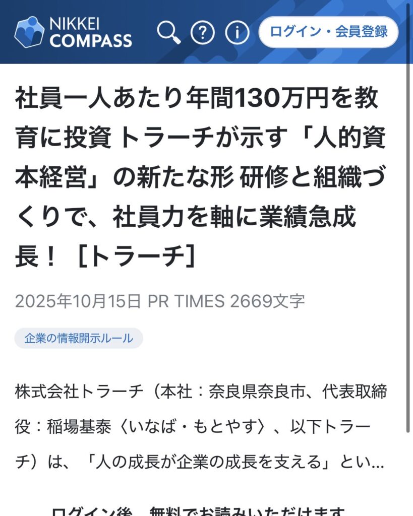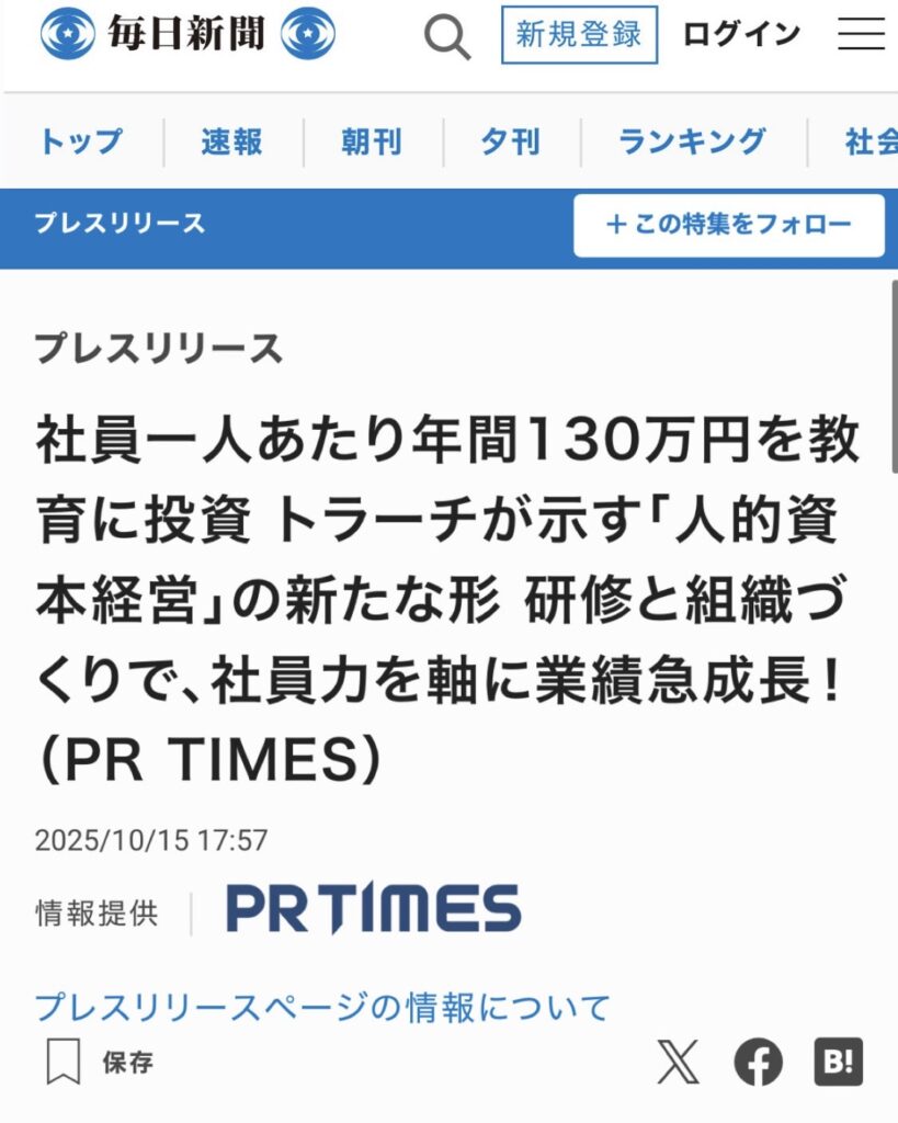 この度、株式会社トラーチの「人的資本経営」に関する取り組みが、毎日新聞・日本経済新聞・エキサイトニュース・PR TIMESビジネス(X)など、複数のメディアに掲載されました🙌