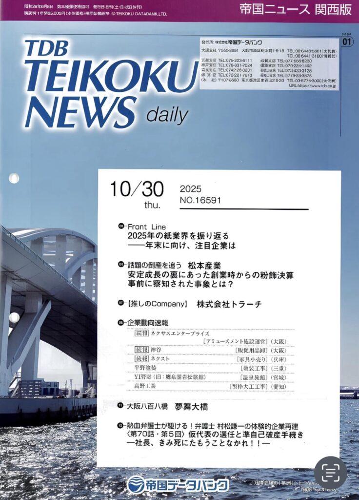 このたび、株式会社トラーチが帝国データバンク様発行の「TEIKOKU NEWS 関西版」に掲載されました🎉🌈