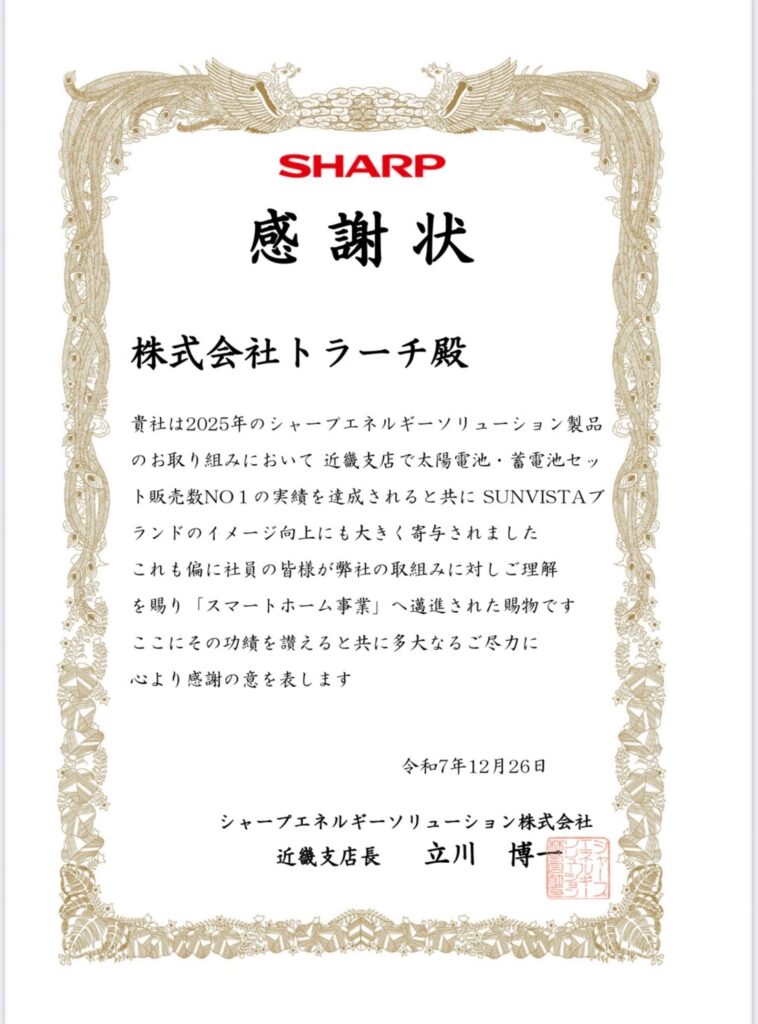 シャープ様より2025年 年間近畿エリア No.1の評価をいただきました🥇